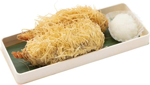 「海老天で満足」をテーマに、冷めてもサクサクで濃厚な海老の味をコンセプトに独自の技法で作り上げました。海老の周りにすり身とたたいた海老、ローストした海老の殻の粉末を混ぜて味を引き立て、天ぷらの衣も一工夫加え、冷めてもサクサクに仕上げています。サイズも一本で大満足の大きさになっています。