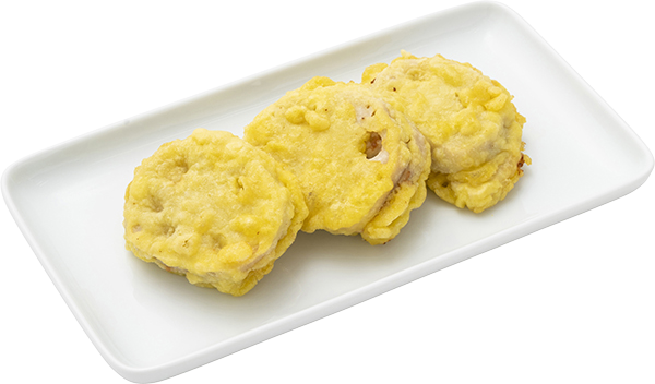 レンコンの間に弊社工場オリジナルの自家製辛子味噌を挟みこんだ天ぷらです。味噌自体はツーンとからしが効いていますが、天ぷらにして油がまわることで、マイルドな甘みのある辛子味噌に変化して味わい深くなります。