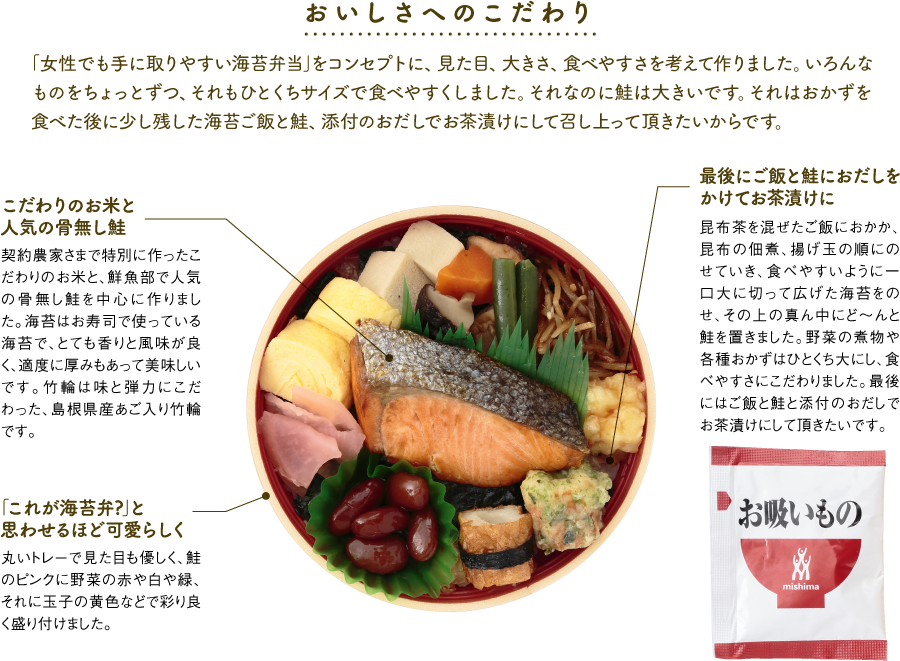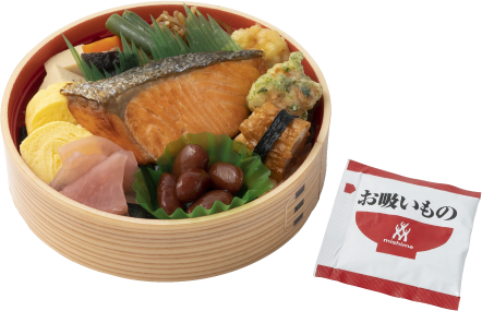白飯(国産米)、鮭、煮物、白身魚と豆腐のふんわり天、きんぴらごぼう、ちくわ、金時豆、玉子焼、青のり、海苔、ごま、お吸い物