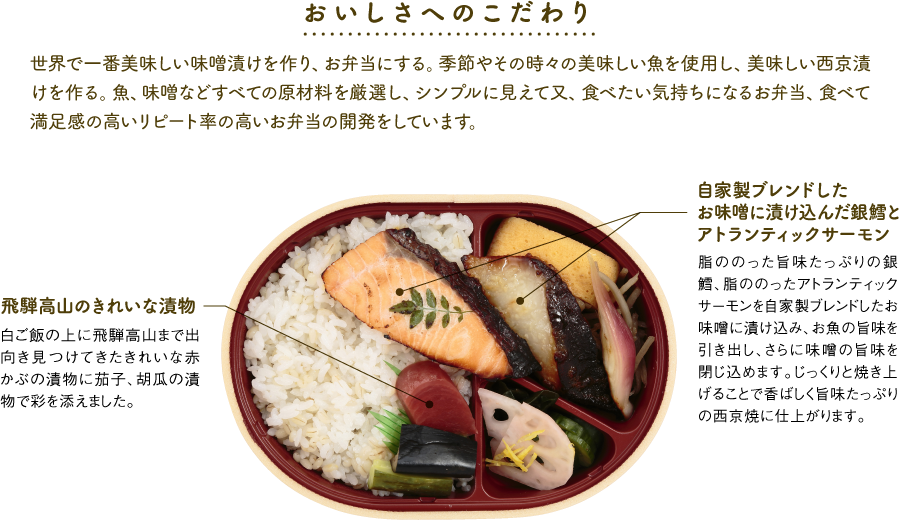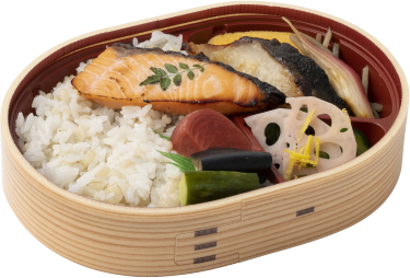 大麦御飯【米(国産)、大麦】、銀鱈西京焼、サーモン木の芽焼、玉子焼、きんぴらごぼう、れんこん梅肉漬けときゅうりとわかめの酢の物、きゅうりとなすと赤かぶ漬物、みょうが酢漬け、調味料(アミノ酸)、酸味料、(原材料の一部に小麦、りんご、大豆を含む)