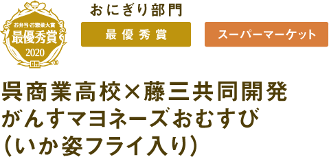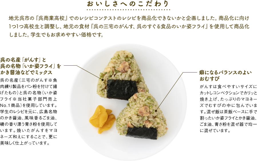 | 原材料 | 茶飯(国産米)、がんす、大根調味漬、イカフライ、マヨネーズ、かき醤油、青さ粉、のり(国産)、ごま油/加工澱粉、調味料(アミノ酸等)、酒精、卵殻Ca、酸味料、着色料(カロチノイド、紅麹、クチナシ、ウコン、カラメル、赤3、赤106)、膨張剤、保存料(ソルビン酸K、ポリリジン)、乳化剤、pH調整剤、甘味料(キシリット、ステビア、甘草)、クエン酸Na、ソルビット、酸化防止剤(V.C)、香辛料、(一部に小麦・卵・乳成分を含む) |