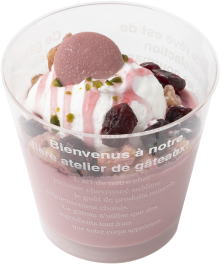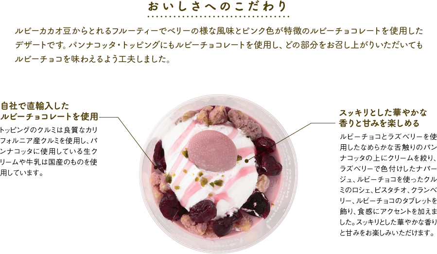 牛乳、クリーム、フランボワーズピューレ、乳等を主要原料とする食品、ルビーチョコレート、砂糖、くるみ、ドライクランベリー、ナパージュ(水飴、砂糖、洋酒)、ゼラチン、ゼラチン加工品、ピスタチオ、乳化剤、pH調整剤、酸化防止剤(クエン酸)、香料、ゲル化剤(増粘多糖類)(原材料の一部に大豆を含む)