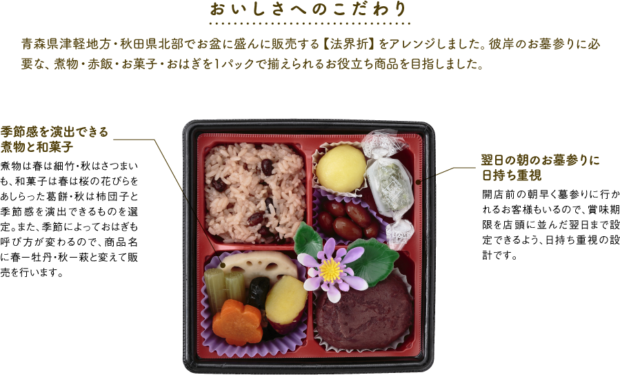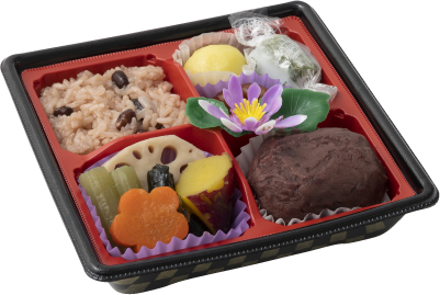 おはぎ(国内製造)、赤飯(国産米)、煮物、煮豆、昆布巻き、生和菓子、お菓子