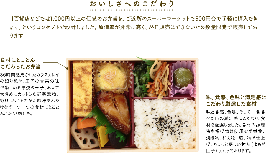 米(茨城県産)、玉子焼き、カラスカレイの照り焼き、煮物、しんじょ、団子、小松菜胡麻和え、きんぴらごぼう