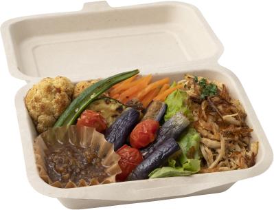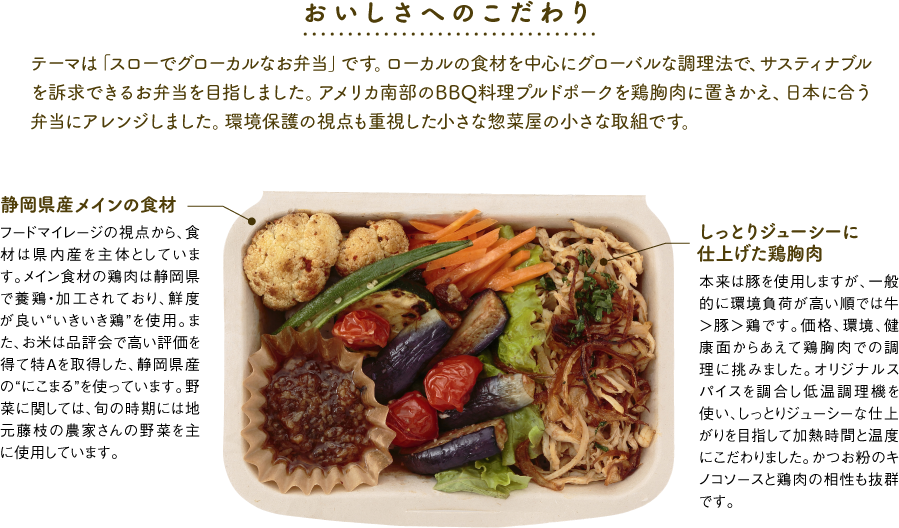 | 原材料 | ご飯(米、静岡県産)、鶏肉(静岡県産)、野菜のコンフィ(カリフラワー、ナス、トマト、ニンニク、その他)その他おかず きのこソース(醤油、みりん、ぶなしめじ、エリンギ、玉ねぎ、酢、砂糖、その他)/糊料(寒天)(一部に小麦、大豆、鶏肉、りんごを含む) |