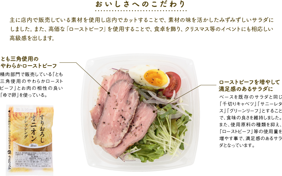 キャベツ、サニーレタス、グリーンリーフ、アーリーレッド、ローストビーフ、かいわれ、ミニトマト、卵、ブラックペッパー