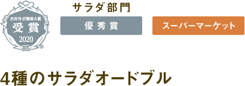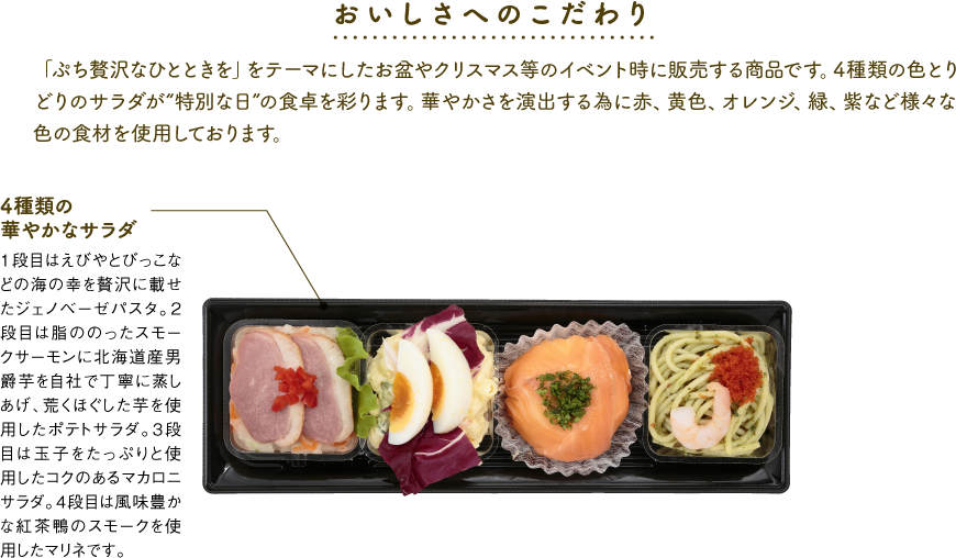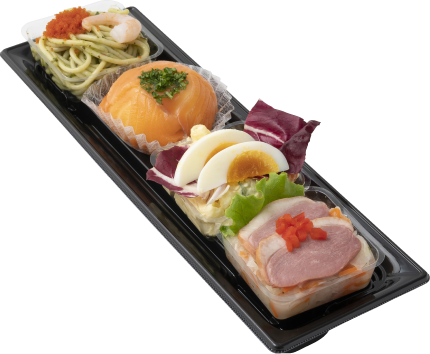 スモークサーモンポテトサラダ、玉子マカロニサラダ、紅茶鴨のマリネ、ジェノベーゼパスタサラダ