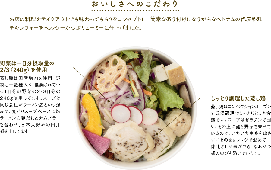 米粉、タピオカ粉、鶏肉、もやし、キャベツ、ホウレン草、グリンカール、サニーレタス、紫キャベツ、玉葱、赤玉葱、人参、ズッキーニ、水菜、ふくろ茸、厚揚げ、ラディッシュ、海老、乾燥玉ねぎ、生姜、魚醤、塩、醤油、胡椒、あじ、カツオ節、貝柱/調味料(核酸、アミノ酸等)、カラメル色素、香料、(原材料の一部に鶏肉・海老・卵・小麦・大豆・ゼラチン・胡麻を含む)