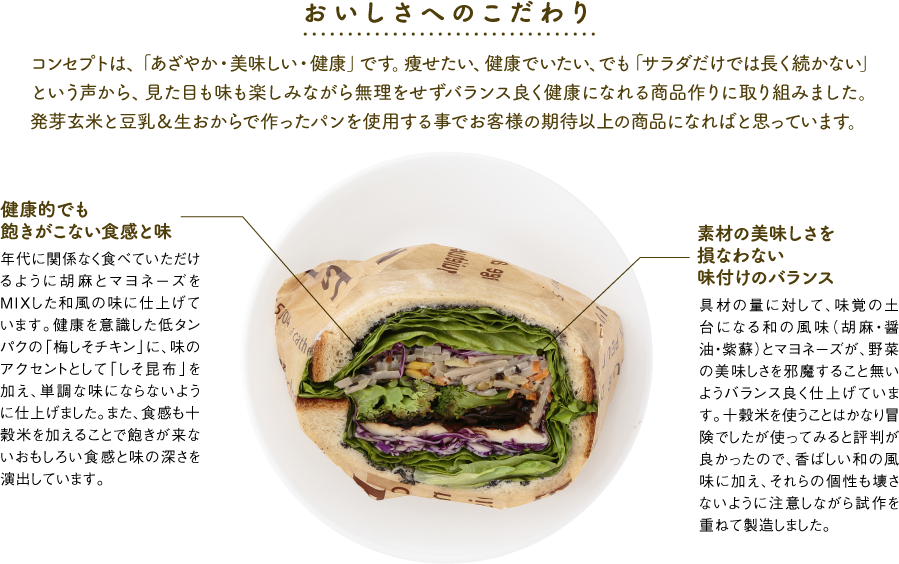 パン、チキン、グリーンリーフ、キャベツ、砂糖、ブロッコリ、蓮根、ごぼう、人参、胡麻、マヨネーズ、醤油、しそ昆布、コーン、枝豆、十穀、食塩、酢