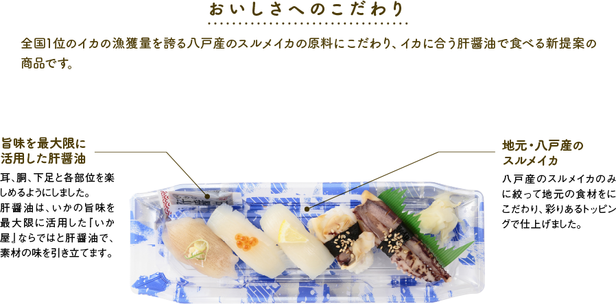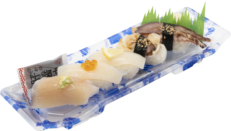 酢飯(国産米)、いか、甘酢生姜、肝醤油、煮たれ、味付けいくら、わさび、レモン、白ごま、わけぎ、生姜、海苔