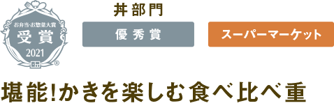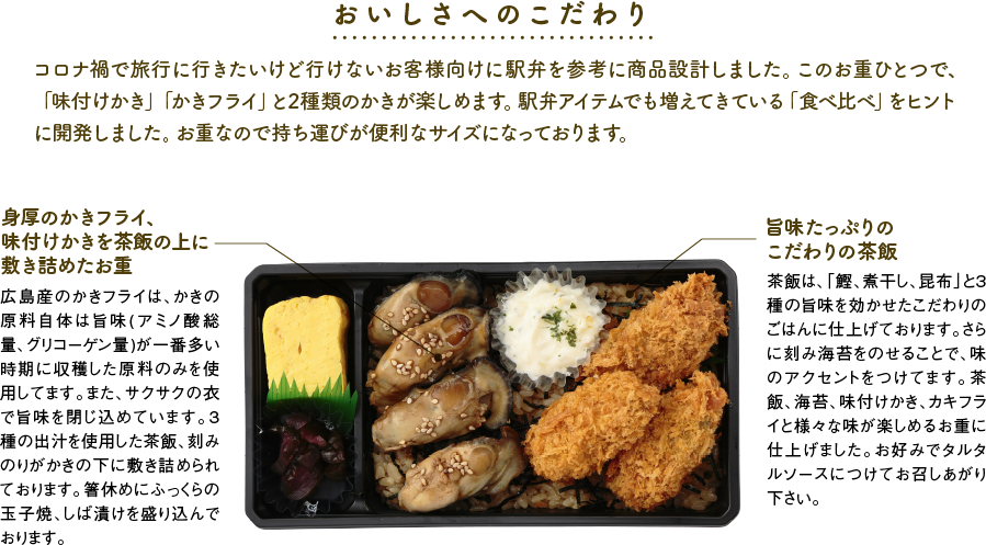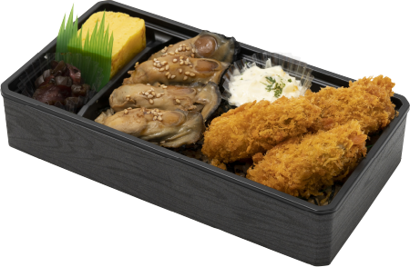 混ぜご飯、かきフライ、味付けかき、玉子焼、タルタルソース、しば漬け、ごま、海苔、パセリ