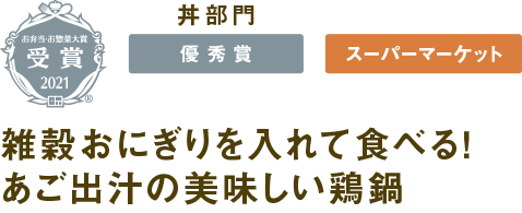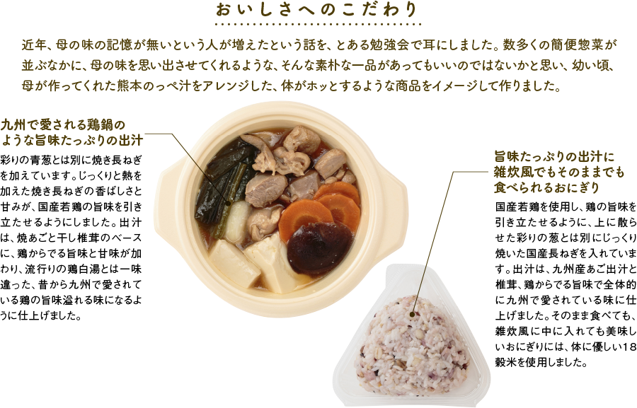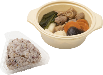 18穀米(黒米、もち麦、こがし麦、アマランサス、押麦、白ごま、黒ごま、もちきび、もちあわ、とうもろこし、たかきび、ひえ、赤米、キヌア、緑米、発芽玄米、もち米、はと麦)、鶏肉、豆腐、ネギ、人参、椎茸、あごだし、醤油、砂糖、調味料(アミノ酸等)