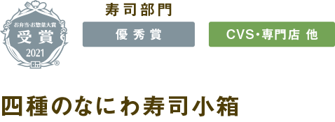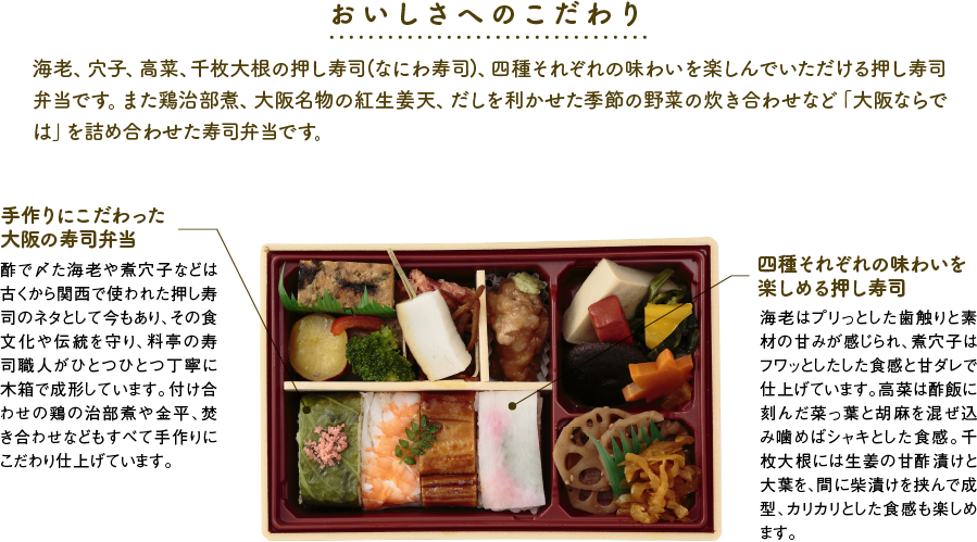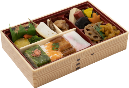 | 原材料 | 押し寿司(海老、穴子、高菜、千枚大根と大葉)(国産米使用)、鶏治部煮わさび添え、高野豆腐、蒟蒻、生姜かき揚げ、福差玉子焼、焼き蒲鉾串、牛蒡と人参の金平、さつまいもの蜜煮、ブロ ッコリー、蓮根金平、椎茸甘煮、法蓮草おひたし、木の葉人参、ハリハリこうこ、八幡蒟蒻、赤パプリカ、黄パプリカ、でんぶ/pH調整剤、酢酸Na、グリシン、調味料(アミノ酸等)、保存料(ソルビン酸K)、着色料(三二酸化鉄、ステビア)、一部にえび・小麦・卵・乳成分・大豆・鶏肉・さば・ごまを含む) |