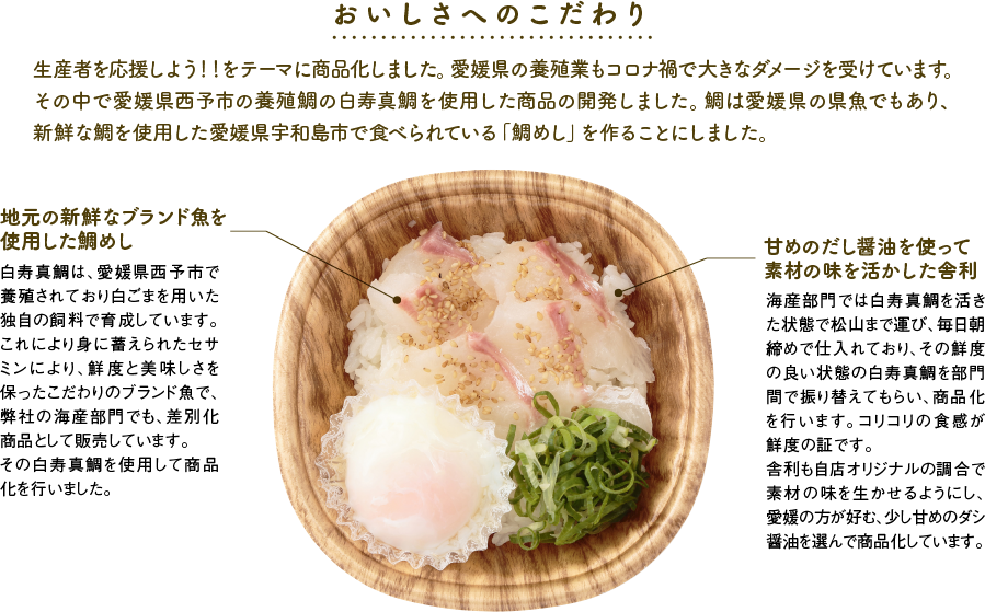 めし(国内産)、たい、果糖ぶどう糖液糖、鶏卵、醸造酢、ねぎ、食塩、煎り胡麻、酒精、食物繊維、還元水あめ、醸造調味料、こんぶエキス、砂糖、米、米こうじ