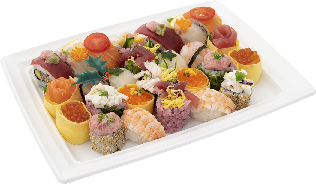 | 原材料 | 酢飯(新潟県産米)、エビ、玉子焼、マグロ、サ ーモン、きゅうり、タイ、いくら、貝サラダ、梅加工品、イカ、レタス、とび卵、トマト、ごま、レモン、マヨネーズ、加工わさび、青粉/pH調整剤、加工澱粉、トレハロース、調味料(アミノ酸等)、グリシン、ソルビット、増粘剤(増粘多糖類、加工澱粉)、酸味料、着色料(野菜色素、カロチノイド、クチナシ、黄4、黄5、赤102、カラメル)、膨張剤、乳化剤、酸化防止剤(V.C)、酒精、香料、香辛料抽出物、セルロース、ピロリン酸Na、酵素、炭酸Ca、(一部に小麦・卵・乳成分・えび・かに・いか・いくら・さけ・大豆・ゼラチン・ごまを含む) |