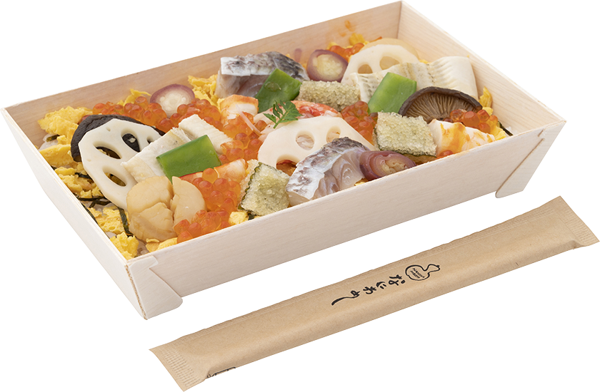 | 原材料 | 寿司飯(国産米使用)、海老、蟹身、いくら、鯛、子持ち昆布、酢蓮根、椎茸、帆立貝柱旨煮、茗荷、青身野菜、錦糸玉子、海苔、木の芽/調味料(アミノ酸等)、酢酸Na、グリシン、(一部に卵、小麦、えび、かに、いくら、大豆、さばを含む) |