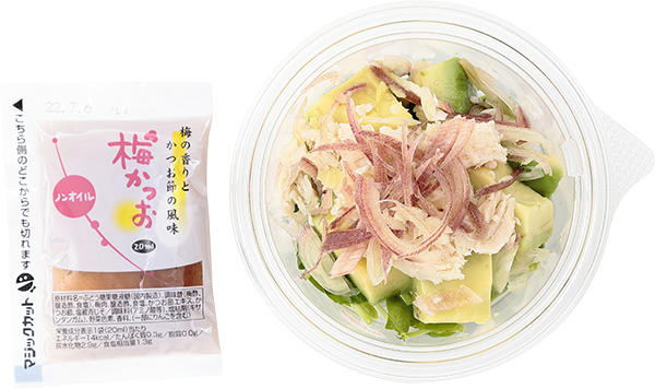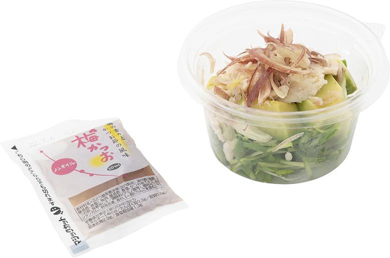 | 原材料 | アボカド、ノンオイル梅かつお(水、ぶどう糖果糖液糖、調味酢、梅肉、醸造酢、食塩、かつお節エキス、かつお節、塩蔵青じそ)、豆苗、みつせ鶏ささみ肉の蒸し鶏(鶏肉(九州産)、発酵調味料、でん粉、砂糖、卵白粉、食塩)、みょうが |