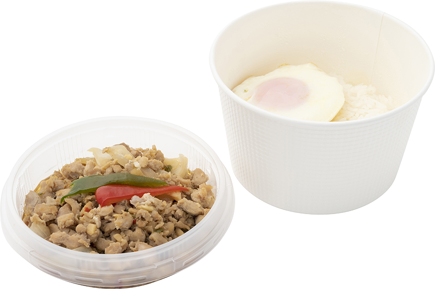 | 原材料 | 鶏肉(国産)ジャスミンライス(タイ産)コシヒカリ( 国産)卵、玉葱、ピーマン、赤ピーマン、オイスタ ーソース、ナンプラー、砂糖、サラダ油、ホーリ ーバジル、 |