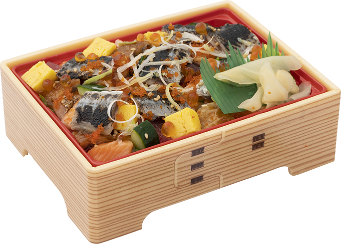 米(国産)、国産ゆず皮、〆さんま、さんま蒲焼、北海道産いくら、まぐろ、サーモン、寿司えび、焼きハラス、数の子バラ子、胡瓜、卵、レタス、白髪ねぎ、白ごま、醤油、わさび、がり