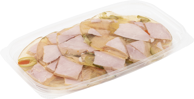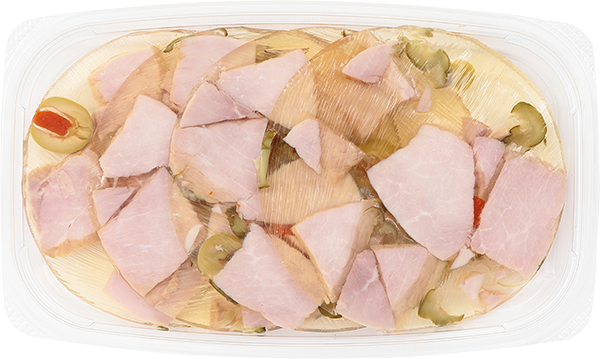| 原材料 | 豚肉(カナダ)、ワインビネガー、ピクルス、アスピックゼリー(大豆・小麦を含む)、オリーブ、ゼラチン、食塩、赤ピーマン、砂糖、乳たん白、卵たん白、ぶどう糖、乳糖、コラーゲン、香辛料/ソルビトール、調味料(アミノ酸等)、リン酸塩(Na)、酸味料、酸化防止剤(VC)、発色剤(亜硝酸Na)、カラメル、ウコン、塩化Ca |