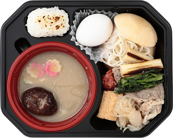 麦を蒸して作った麹を主原料に、大豆と塩と米だけでつくられたかまど白味噌は、醤油ベースのタレと違い、素材の風味を壊すことなく旨味が口の中に広がります。長崎県名物の五島うどんは、新発田市ブランドのお味噌汁に合う新発田麩の中に入れて可愛く盛り付けました。締めの焼きおにぎりは鹿児島産の新米を使用しています。