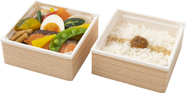 八寸をイメージさせる二段重の弁当箱に、彩り鮮やかな新鮮野菜と魚(日替わり)の西京焼きをバランスよく盛り付けています。上の段がおかず、下の段は当店オリジナルの自家製野菜味噌がお供になったご飯が入っています。