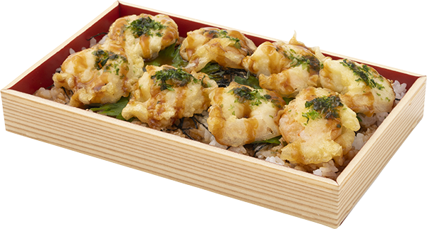 海老天丼と天むすのハイブリットなイメージを形にしました。通常、天むすはエビ天を食べたら残りはご飯と海苔だけになり、天丼は華やかな具材がどっさりですが…。海老天だけをガッツリ食べたいという、海老が大好きな担当者のエゴと欲望のままに開発した海老天重です。