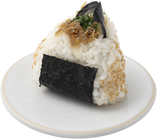 藻塩をふったご飯の中央にちりめん山椒を入れ、上に出汁を含ませた揚げ茄子を添え結び、追いちりめん山椒、ねぎをかけます。おむすびの横には白ごまをたっぷりまぶしています。