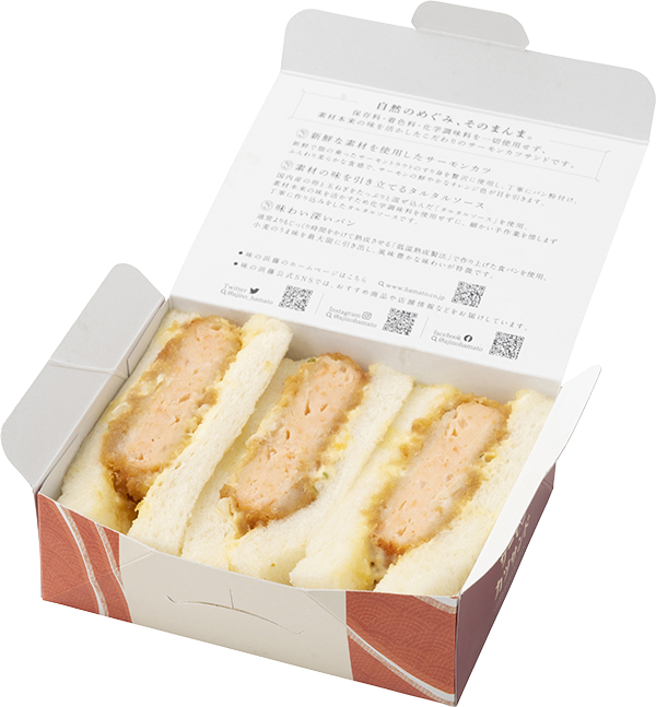 | 原材料 | サーモンカツ(国内製造)、食パン、タルタルソ ース、マヨネーズ、ねりからし/加工澱粉、増粘剤(加工澱粉、増粘多糖類、アルギン酸エス テル、キサンタン)、イーストフード、ビタミンC、ソルビット、酸味料、香辛料抽出物、カゼイン Na(一部に小麦・卵・乳成分・さけ・大豆・りんごを含む) |