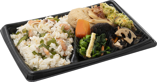 期間限定の三陸産の茎ワカメの原料を使用した季節感のある炊き込みご飯のお弁当を開発しました。鮭を炊き込んだご飯に食感の良い茎ワカメを合わせています。副菜には筍や菜の花で春を感じさせるようなお弁当に仕上げています。