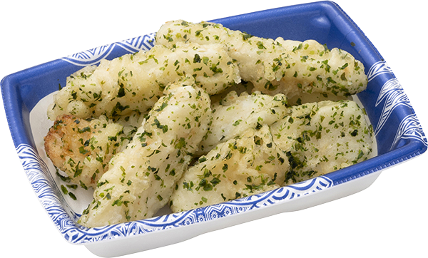 天ぷらにした山芋に青さ粉と塩を振り絡めただけのシンプルな味付けです。青さ粉は国産の色鮮やかなものを使用。塩は出汁塩の伊勢えびのだし塩を使用し、バッターに入れず後から絡めることで香りがとばずにしっかりと味わえます。