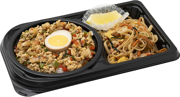 | 原材料 | 白飯(国産米)、ガパオの具(鶏肉、玉ねぎ、ピ ーマン、パプリカ、食用油、ナンプラー、発酵調味料、砂糖、ニンニク、オイスターソース、醤油、豆板醤、バジル)パッタイ(ビーフン麺、液卵、人参、もやし、オイスターソース、食用油、ナンプラー、ニラ、砂糖、風味調味料) |