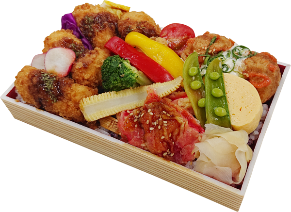 | 原材料 | 富山県アルギットコシヒカリ・ゆかり・串フライ4種・ヘルメスソース・ヤングコーン・ブロッコリー・ラデッシュ・レッドキャベツ・赤黄パプリカ・紅生姜串・スナップエンドウ・たこ焼き・明太バラ・タルタルソース・甘酢生姜・天丼たれ・玉子焼き・青ネギ・ごま・ミニトマト・レモン・天ぷら粉・パセリ粉 |