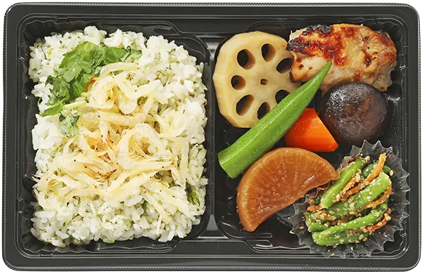 白海老ご飯(米国産、国産)、煮物(大根、蓮根、椎茸、人参)、鶏もも焼き、いんげん胡麻和え、オクラだし漬け、三つ葉、その他