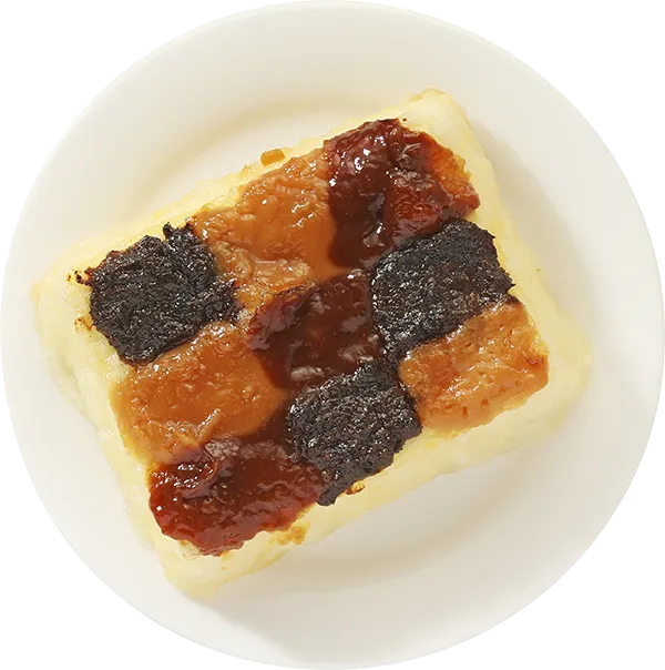苦みのあるばっけ味噌、甘みの強い生姜味噌、旨味とコクの強いにんにく味噌の異なる3タイプの違う味噌を使う事で、異なる組み合わせの味を飽きずに食べれるように仕上げました。また、前日から水切りをし、水分を抜いた豆腐に、片栗粉をまぶして油調してから焼き上げることで、味噌が落ちにくく香ばしくなるように仕上げました。