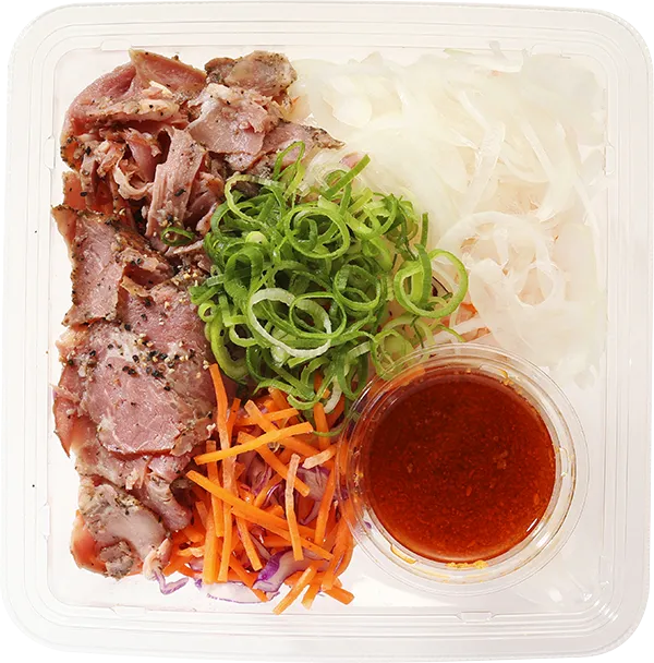 | 原材料 | ビーフン(タイ製造)、大根、豚肉加工品、玉葱 、アジアンチリドレッシング(醤油、穀物酢、植物油脂、玉葱加工品、砂糖、その他)、人参、紫キャベツ、葉ねぎ、香味油、食物油脂、花椒 、胡椒/加工澱粉、調味料(アミノ酸等)、糊料(C MC-Na、増粘多糖類)、リン酸塩(Na)、酒精、酢酸Na、酸化防止剤(V.C、V.E)、乳化剤、カロチノイド色素、発色剤(亜硝酸Na)、pH調整剤、グリセリン脂肪酸エステル、(一部に卵・乳成分・小麦・牛肉・ごま・大豆・鶏肉・豚肉を含む) |