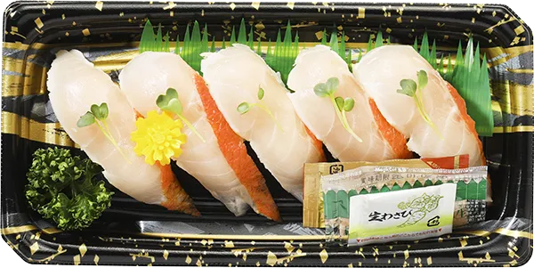 | 原材料 | 国産米、調味酢(ぶどう糖果糖液糖、砂糖)、醸造酢、食塩、炙り金目鯛、加工わさび(中国の本わさび、西洋わさび加 工品、還元水あめ、なたね油、大豆植物繊維)、しょうが酢漬(しょうが、酢漬)、こいくちし ょうゆ(脱脂加工大豆、小麦、大豆) 、パセリ |