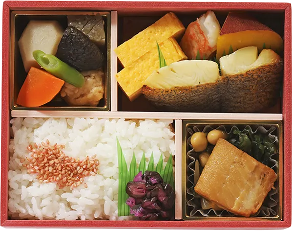 白飯(国産)、煮物(里芋、人参、えび入りつみれ、蒟蒻、さつま芋、かに風味蒲鉾、椎茸、その他)、カレイ西京焼、卵焼、昆布大豆蒟蒻煮、カレイ煮付け、しば漬け、など