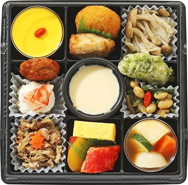 | 原材料 | じゃが芋里芋人参ズッキーニあんかけ、牛すき焼き、南瓜スープゼリー、舞茸えのき茸ぶなしめじ煮、茶碗蒸し、南瓜コロッケ、昆布大豆蒟蒻煮、卵焼、あぶらかれい竜田揚、鶏つくね、ポテトサラダ、えんどう豆さつま揚、かに風味蒲鉾揚、さつま芋煮、かに風味蒲鉾煮、茹で人参 |
